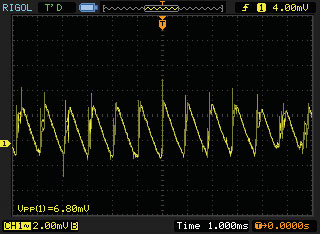 測試輸出電壓紋波時,首先由工控機來控制程控電源輸出,其輸出能夠使電源進(jìn)入正常工作狀態(tài),然后控制程控電子負(fù)載使電源達(dá)到100%負(fù)載狀態(tài),再由多通道開關(guān)將DS1302CA示波器接入到電源的輸出端,通過工控機將數(shù)字示波器設(shè)置為直流耦合,使用1:1的探針輸入。另外,為了便于更好地觀察穩(wěn)定的紋波信號,可以打開示波器的“帶寬限制”。最后,將數(shù)字示波器測量出的紋波信號峰峰值上傳至計算機中存儲起來,便得到了該電源的紋波電壓,如圖4所示。