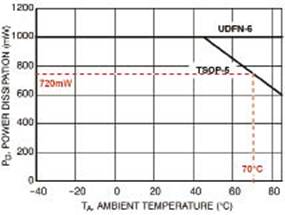 另一種評估封裝熱特性對應(yīng)用性能影響的方法是檢查功率下降曲線。圖2顯示了NCP1529的曲線,詳述了µDFN-6和TSOP-5封裝最大環(huán)境溫度閾值與功率耗散之間的關(guān)系。