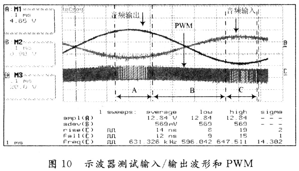圖10測(cè)試了TFA9810T功放音頻輸入端為1 kHz的2V。單音頻信號(hào)波形,輸出端揚(yáng)聲器端到GND間為12.84V。,圖9中LPF。濾波前功放輸出的PWM波形。圖11~圖13分別拓展了圖10中A/B/C區(qū)。