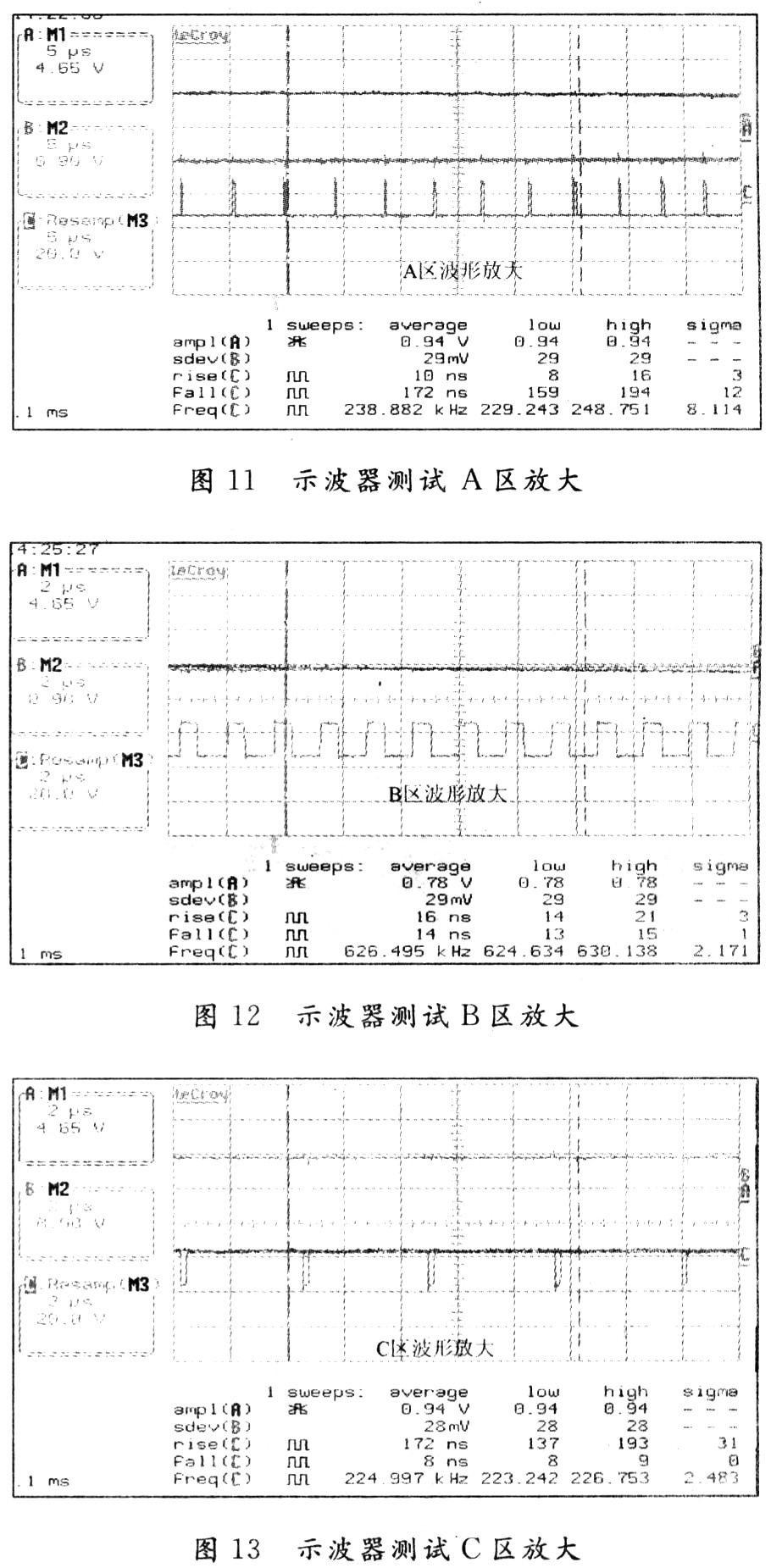 由圖10~圖13可知,輸入波形疊加有高頻雜波。說(shuō)明前端引入不良干擾,需進(jìn)一步分析改進(jìn);輸出波形平滑,無(wú)交越失真,Deadtime特性較好;輸入/輸出正弦波相位相反,直接由電阻RA128等形成閉環(huán)負(fù)反饋通路,降低了噪聲干擾,并進(jìn)行增益控制。A,B,C區(qū)的拓展圖輸出正弦波峰、波谷、S區(qū)域處PWM的頻率分別為238.8 kHz,224.9 kHz,626.4 kHz,占空比不同,符合三角波采樣特性。圖中波峰、波谷處PWM脈沖fall下降沿和rise上升沿更為陡峭,相比S形區(qū)域,包含大量高頻諧波,易引起EMI輻射,但通過(guò)巴特沃思二階濾波器濾波后,輸出正弦波良好,無(wú)明顯高頻雜波迭加,EMC測(cè)試也無(wú)明顯對(duì)外輻射頻率,滿足了設(shè)計(jì)需要。