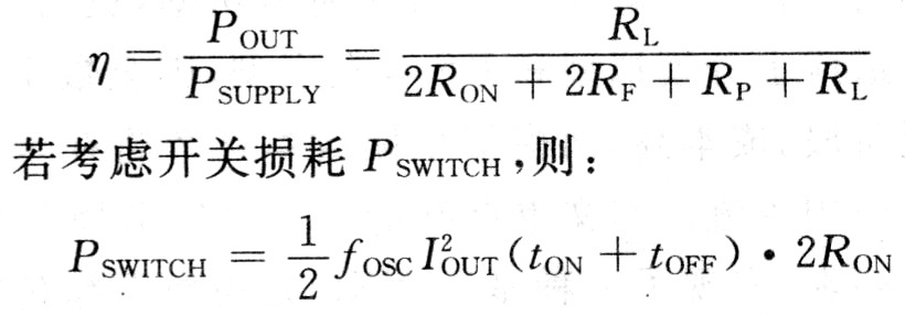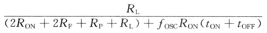 假設(shè)D類功放MOSFET導(dǎo)通電阻為RON,所有其他無(wú)源電阻為RP,濾波器電阻為RF,負(fù)載電阻為RL,則不考慮開關(guān)損耗的效率為: