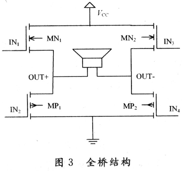 全橋MOSFET管輪流成對(duì)導(dǎo)通,理想狀態(tài)一對(duì)導(dǎo)通,另一對(duì)截止,但實(shí)際上功率管的開啟關(guān)斷有一個(gè)過(guò)程。過(guò)渡過(guò)程中,必有一瞬間,如圖3所示,在IN1/IN3尚未徹底關(guān)斷時(shí)IN2/IN4就已開始導(dǎo)通;因MOSFET全部跨接于電源兩端,故極端的時(shí)間內(nèi),可能會(huì)有很大的電壓電流同時(shí)加在4個(gè)MOSFET上,導(dǎo)致功耗很大,整體效率下降,而且器件溫升加劇,燒壞MOSFET,降低可靠性。為避免兩對(duì)MOSFET同處導(dǎo)通狀態(tài),引起有潛在威脅的很大短路電流,應(yīng)保證一對(duì)MOSFET導(dǎo)通和另一對(duì)MOSFET截止期間有一個(gè)很短的停滯死區(qū)時(shí)間(Dead-time),這個(gè)時(shí)間由Logic邏輯控制器控制,以有效保證一組MOSFET關(guān)斷后,另一組MOSFET再適時(shí)開啟,減小MOSFET損耗,提高放大器效率。