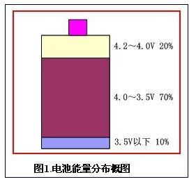 目前手機(jī)使用的電池都是鋰離子電池,在手機(jī)工作時(shí),電池不斷放電,電池電壓不斷下降,電池放電的電流不同,電壓下降的曲線速率也不同,一般來說,在電池電壓3.5V~4.2V之間集中了90%的電池能量。電池能量分布如下圖所示。