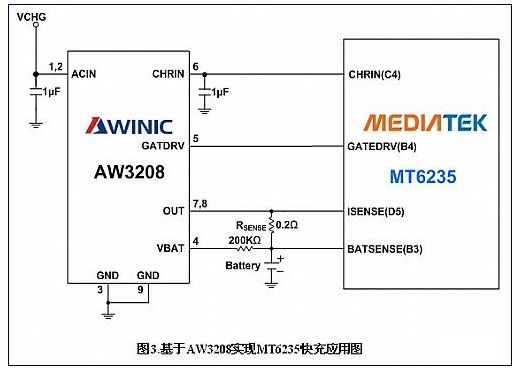 上海艾為電子專門針對(duì)MT6235/36平臺(tái)推出的AW3208在增加OVP功能的同時(shí),提供了智能充電功能,以滿足快速充電的功能。如圖2所示,AW3208內(nèi)置專有的K-ChargeTM技術(shù),可根據(jù)芯片溫度智能調(diào)整輸出電流,以保證在充電期間整個(gè)充電系統(tǒng)的安全。使得手機(jī)在實(shí)現(xiàn)快速充電的時(shí)候不會(huì)因?yàn)橛捎诃h(huán)境溫度較高或者充電電流過大導(dǎo)致芯片進(jìn)入過溫保護(hù)使得充電沒法正常進(jìn)行。圖3為在MT6235上的典型應(yīng)用圖。
