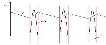 一般開關(guān)電源為容式濾波,在輸入與整流濾波部分電磁噪聲主要是由整流過程中造成的電流尖峰、電壓波動(dòng)所引起的。正弦波電源經(jīng)過電源濾波器進(jìn)行差模、共模信號(hào)衰減后,由整流橋整流、電解電容濾波,得到的電壓作為高頻逆變部分的輸入電壓。由于濾波電容的存在,使整流器不象純整流那樣一組開通半個(gè)周期,而是只在正弦電壓高于電容電壓時(shí)才導(dǎo)通,造成電流波形非常陡峭,同時(shí)電壓波形變得平緩。電流、電壓的波形如圖2所示。