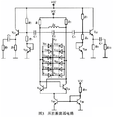 壓控振蕩器按構(gòu)成原理可分為反饋型振蕩器和負(fù)阻型振蕩器2大類。這里采用負(fù)阻型振蕩器,其主要是由負(fù)阻器件和諧振回路組成的振蕩器,利用負(fù)阻器件的負(fù)電阻效應(yīng)與諧振回路中的損耗正電阻相抵消,維持諧振回路的穩(wěn)定振蕩。圖3為壓控振蕩器電路。