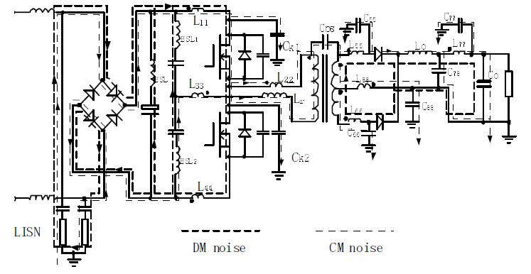 通常電路中的共模干擾和差模干擾是同時(shí)存在的,共模干擾存在于電源的任意一個(gè)相線與大地之間,差模干擾存在于相線與相線之間。法國(guó)Grenoble 電技術(shù)實(shí)驗(yàn)室的Teuling、Schnaen 和Roudet 基于由MOSFET 構(gòu)成的400W、開關(guān)頻率為100KHz 的斬波電路實(shí)驗(yàn)?zāi)P偷难芯勘砻?,低頻時(shí)差模干擾占主導(dǎo)地位;高頻時(shí),共模干擾占主導(dǎo)地位,這說(shuō)明開關(guān)電源的差模干擾和共模干擾對(duì)電路的影響程度是不同的;另一方面,線路寄生參數(shù)對(duì)差模干擾和共模干擾的影響也不同,由于線間阻抗與線———地阻抗不同,干擾經(jīng)長(zhǎng)距離傳輸后,差模分量的衰減要比共模大。因此,為了解決開關(guān)電源的傳導(dǎo)噪聲問(wèn)題,需要首先區(qū)分共模和差模干擾,這就需要建立共模和差模噪聲路徑,然后對(duì)它們分別進(jìn)行仿真和分析,這種方法便于我們找到電磁干擾問(wèn)題的根源,便于問(wèn)題的解決。