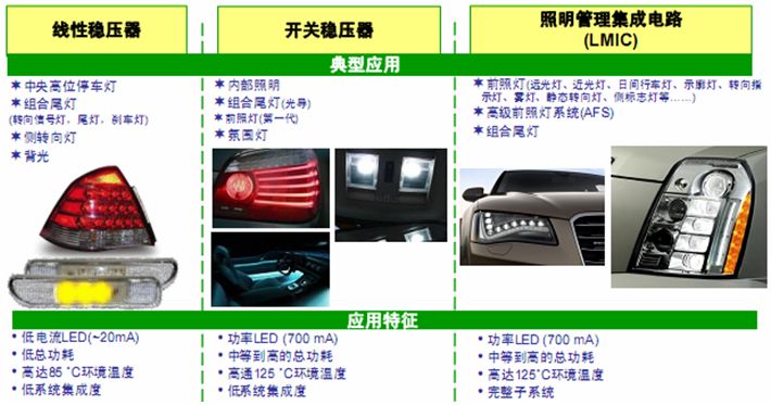 隨著LED性能不斷提升及成本不斷下降,在汽車內(nèi)部及外部照明中的應用領域越來越寬。不同應用對LED電流的要求又各不相同,故需要結合具體應用要求,選擇適合的LED驅(qū)動器方案,如線性恒流穩(wěn)流器、線性穩(wěn)壓器或開關穩(wěn)壓器等。本文介紹幾種應用比較廣泛的LED驅(qū)動器及具體方案,供設計人員在進行汽車照明設計時參考。