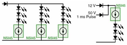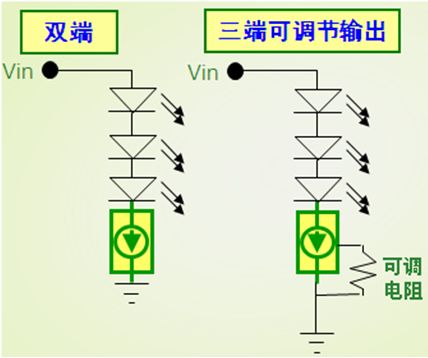 適合低電流LED應用的CCR,可以采用安森美半導體運用專利自偏置晶體管(SBT)技術開發(fā)出來得NSI45系列。這系列CCR包含雙端固定輸出和三端可調(diào)節(jié)輸出兩種類型,電流等級涵蓋10至180 mA,雙端及三端CCR電路圖如圖2所示。其中三端可調(diào)節(jié)輸出CCR包括電流30至80 mA(SOT-223)及60至150 mA(DPAK)等不同選擇,能夠用于滿足特定電流設置要求。