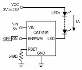 而在要求驅(qū)動大電流的高亮度LED汽車照明應用中,可以采用安森美半導體的CAT4101高亮度線性LED驅(qū)動器。CAT4101能驅(qū)動一串電流高達1 A的高亮度LED,且滿載時的壓降僅為極低的0.5 V。這種簡單方案不要求電感,消除開關噪聲,將元件數(shù)量減至最少,并簡化設計,典型應用電路如圖5所示。
