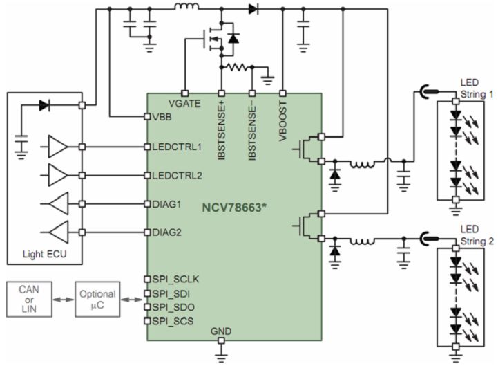 一般而言,汽車前照燈要求支持從單個LED到多串LED,電壓可高達60 V;此外,還要求支持脈寬調(diào)制(PWM)調(diào)光(如用于示廓燈)、高集成度、高能效、LED串低電磁輻射、集成診斷及通信接口等。安森美半導體針對LED汽車前照燈系統(tǒng)開發(fā)了NCV78663電源鎮(zhèn)流器及雙LED驅(qū)動器。NCV78663是先進的高可靠性、高能效的系統(tǒng)級芯片(SoC) LED驅(qū)動器,支持達2 A電流,提供高于90%的總能效,驅(qū)動高達60 V電壓的多串LED,能以PWM調(diào)光維持色溫及控制平均電流,使設計人員能夠以一顆高集成度的SoC控制遠光燈及近光燈、日間行車燈、轉(zhuǎn)向指示燈及霧燈,所需外部元件極少。這器件通過SPI接口與外部微控制器通信,在上電后動態(tài)地控制系統(tǒng)參數(shù)、檢測LED工作狀態(tài)并反饋診斷信息。圖8顯示的是NCV78663在先進的汽車前照燈應用中的電路圖。