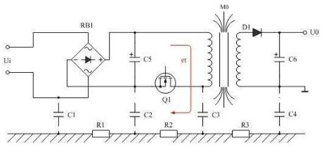 值得一提的是,開關(guān)電源變壓器初級線圈的漏感產(chǎn)生的反電動勢et,在所有干擾信號之中是最不容忽視的,如圖3所示。當電源開關(guān)管關(guān)斷的時候,開關(guān)電源變壓器初級線圈的漏感產(chǎn)生的反電動勢et幾乎沒有回路可釋放,一方面,它只能通過初級線圈的分布電容進行充電,并讓初級線圈的分布電容與漏感產(chǎn)生并聯(lián)諧振;另一方面,它只能通過輻射向外進行釋放,其中通過對地電容C3與大地相連,也是反電動勢et釋放能量的一個回路,因此,它對輸入端也會產(chǎn)生共模信號干擾。
