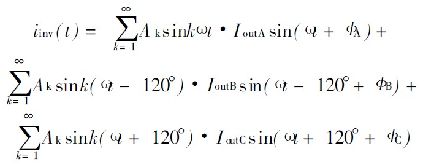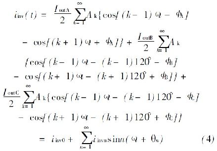 式中, I inv0是直流分量的逆變器輸入電流; I invn 是n 階部分的電流。通過(guò)公式( 4) 可看到, I outA = I outB = I outC和ΦA= ΦB= ΦC , 同時(shí)有I invn = 0, 如果n> 0 三相負(fù)載電流是平衡的。否則, 交流成分存在會(huì)造成連鎖反應(yīng)。