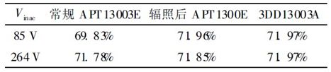 表3是AP3765序列充電器中采用經(jīng)過(guò)10 kGy電子輻照的APT13003E 及3DD13003A 在85 V 和230 V 輸入電壓下輸出負(fù)載電流分別是0. 15 A、0.30 A、0. 45 A、0. 60 A 系統(tǒng)平均效率的結(jié)果。從表3中可以看出, 10 kGy電子輻照后的APT13003E的效率與3DD13003A 的效率基本相同。