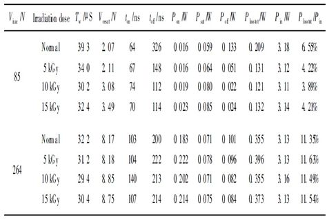 從表2中可以看出, 在85 V 交流輸入電壓下,輻照之后的APT13003E 比未輻照的APT13003E 的關(guān)斷延時(shí)有了大幅的減小, 因此關(guān)斷損耗大幅的減小, 如輻照為10 kGy的管子的關(guān)斷損耗減小為未輻照管子的1 /6; 導(dǎo)通延時(shí)有所增加, 但增加的幅度較小, 導(dǎo)通損耗有較小的增加; 飽和壓降隨輻照劑量的增加而增加, 因此通態(tài)損耗隨輻照劑量的增加而增加。開(kāi)通損耗、通態(tài)損耗的增加與關(guān)斷損耗的減小是一對(duì)矛盾, 因此必須選擇合適的輻照劑量, 才能使開(kāi)關(guān)晶體管總的損耗最小。