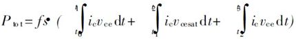 開(kāi)關(guān)晶體管在工作過(guò)程中的損耗分為開(kāi)關(guān)損耗和穩(wěn)態(tài)損耗, 其中開(kāi)關(guān)損耗包括導(dǎo)通損耗和關(guān)斷損耗, 穩(wěn)態(tài)損耗包括通態(tài)損耗和截止損耗, 其中截止損耗占總的損耗的比率很小, 可以忽略不計(jì)。我們把Vce由90% Vindc降到110% Vcesat所用的時(shí)間定義為導(dǎo)通延時(shí), 即圖2中的t1 - t0, 把IC 由90% Icmax下降到0所用的時(shí)間定義為關(guān)斷延時(shí), 即t3 - t2。