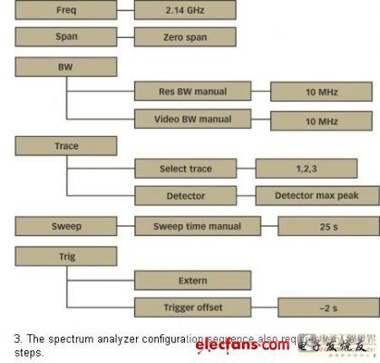 正如已經提到的一樣,頻譜分析器在“零檔”模式下使用。不論是分辨率帶寬還是視頻帶寬,均設為10MHz,因為頻譜分析器被用來測量峰值功率?;谕瑯拥睦碛?,檢測器必須在“最大峰值”模式下設置。選取25s的掃描時間以便獲得對屏幕的整體掃描。選擇外部觸發(fā)器的可選項。利用“觸發(fā)器偏差”特性將屏幕上的軌跡置于中心也是一種明智的選擇。-2s即是合適的。圖3顯示了詳細的配置序列。
