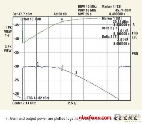 用于頻譜分析器的功能序列顯示在圖4中。此刻,頻譜分析器連接到輸入,且輸入功率在第二條線跡(線跡2)獲取,并保持在“觀察”模式。圖5中的黑色線跡即得。當在輸出再連接分析器之后,從第三條線跡(線跡3)獲得輸出功率,同樣也保持在“觀察”模式。通過設置“輸出偏差”值的參數等級偏差,該值在校準階段被設為43.7dB,從“線跡3”可以直接讀取以dBm為單位的絕對輸出功率,圖5中的綠線即得。通過在鋸齒末端的平面區(qū)域安置標記,可以讀取如圖5 中綠線所示的飽和功率。MW4IC2230MB顯示+47.23dBm的飽和功率。