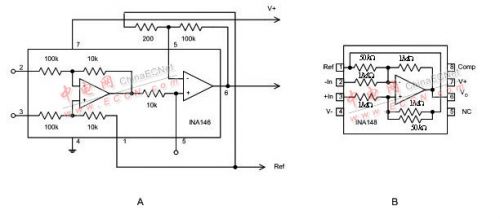 老式分路檢測電路基于差動(dòng)放大器,即周圍帶四個(gè)電阻來設(shè)置增益并提供差動(dòng)輸入的運(yùn)算放大器 (operation amplifier)。這些電阻使運(yùn)算放大器能接受超過其電源軌的共模電壓。不過,這也會(huì)帶來下面一些負(fù)面問題:一是電路必須配置為衰減器,在隨后的運(yùn)算放大器級(jí)中恢復(fù)增益,如圖 2A 中的 IC 結(jié)構(gòu)圖所示,運(yùn)算放大器的增益會(huì)成倍增大第一個(gè)放大器的偏置和漂移量,從而降低整體性能。二是采用高共模電壓差動(dòng)放大器要增加電阻網(wǎng)絡(luò),以使之在仍然只提供單位增益的同時(shí)能夠接受較高的共模電壓。高共模差動(dòng)放大器帶來的影響在于:運(yùn)算放大器的噪聲增益與共模衰減成正比,如圖 2B 所示的差動(dòng)放大器結(jié)構(gòu)采用了 20:1 的內(nèi)部共模衰減,此舉使放大器的偏置、漂移和噪聲都比運(yùn)算放大器本身擴(kuò)大了 20 倍。此外,較大的輸入電阻也會(huì)造成較高的噪聲。