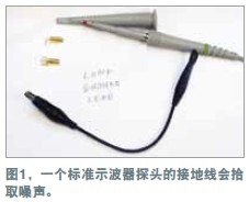 在測(cè)量電源軌的紋波時(shí),必須盡量減小噪聲,因?yàn)榧y波幅度可能很小。示波器探頭是基本的測(cè)量工具,但它們可能引入噪聲與誤差。地線(如與標(biāo)準(zhǔn)示波器探頭連接的那根線)可能增加一些不會(huì)出現(xiàn)在示波器軌跡上的電路噪聲。線路環(huán)就像一根天線,會(huì)提取周圍的雜散磁場。環(huán)路面積越大,提取的噪聲就越多。為證明這個(gè)理論,可將示波器地線連接到探頭尖端,然后到處移動(dòng)。示波器會(huì)隨著地線的移動(dòng)而顯示出噪聲的增減。用一個(gè)示波器探頭及其地線和插座可以做一個(gè)簡單的連接板(圖1)。