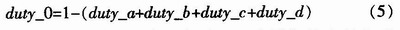 以虛擬整流器、逆變器均工作在第一扇區(qū)為例,相量合成的固定空間電流、電壓相量分別是I6、I1和U6、U1,兩個(gè)空間相量的綜合調(diào)制采用相互嵌套的辦法來(lái)實(shí)現(xiàn)。整個(gè)輸入相電流和輸出相電壓相量合成共有I6-U6、I6-U1、I1-U6、I1-U1、I0-U0 5種組合。每一相量組合的作用時(shí)間用占空比duty來(lái)表示。等式(1~5)反映了占空比的計(jì)算公式。占空比可以通過(guò)表1來(lái)分配給相應(yīng)的開(kāi)關(guān)組合。