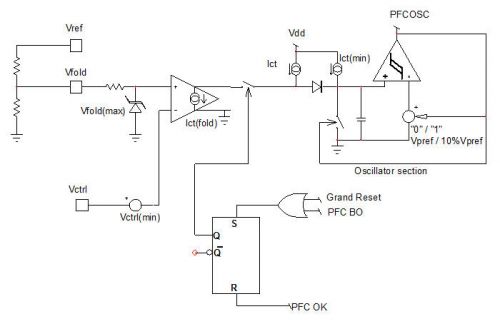 VCTRL與功率及頻率的關(guān)系:當(dāng)輸出功率下降時,VCTRL隨之下降;當(dāng)?shù)竭_反走設(shè)定點時,頻率線性下降;65 kHz版本將最小頻率內(nèi)部設(shè)定為40 kHz。