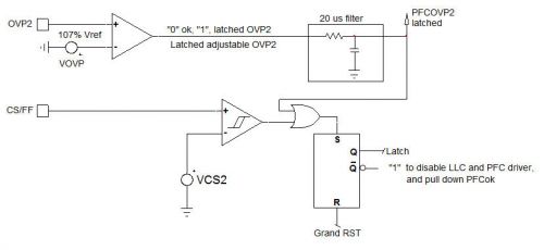 3. 冗余OVP(閂鎖):專用OVP2引腳用來保護大電容;電路中內(nèi)置的20 µs濾波器用來提供更佳的噪聲免疫性。當(dāng)OVP2比較器被觸發(fā)時,PFC及LLC均關(guān)閉。PFCok信號假定為低電平時,PGout被釋放開路,使LLC停止工作。