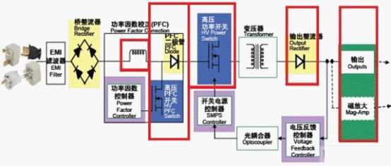在一個電源設(shè)計中,能效規(guī)范對電路段的挑戰(zhàn)主要體現(xiàn)在PFC能效、主轉(zhuǎn)換器能效和次級能效幾個方面。要提高這幾個方面的能效,就必須改善如圖1所示電路紅色框中的元件性能。以下將介紹改善電路段能效的幾種方法。