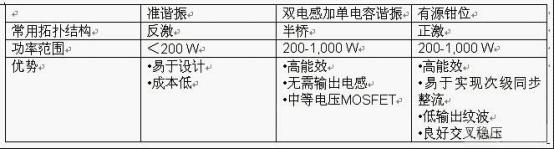 要提高主轉(zhuǎn)換器能效可以采用以下幾種方法。一是通過降低導(dǎo)通阻抗(開關(guān)損耗較高)和/或減小初級峰值電流和均方根電流來降低初級導(dǎo)通損耗;二是考慮采用軟開關(guān)技術(shù)降低開關(guān)損耗;三是通過減少整流器壓降(使用低正向壓降二極管或FET整流器)來降低次級損耗;四是采用更好的磁芯材料來降低磁芯損耗。表1列出了主要軟開關(guān)的拓撲結(jié)構(gòu),可供設(shè)計時參考。