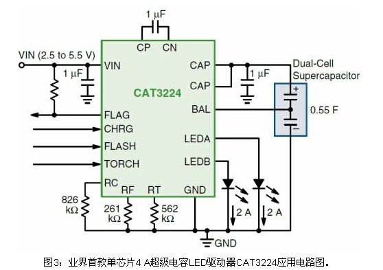 CAT3224則是業(yè)界首款4 A單芯片超級電容LED驅(qū)動器(見圖3),集成了雙模1x/2x電荷泵,提供三項關(guān)鍵功能:精密的超級電容充電控制、電流放電至LED閃光的管理,以及為LED手電筒模式提供恒流。這三種模式的工作電流能以3顆外部電阻作簡易編程,能吸收達4 A的LED閃光脈沖電流。超級電容技術(shù)的高峰值電流優(yōu)勢,結(jié)合CAT3224簡單的并行邏輯接口,使這器件成為采用LED替代氙氣燈的應用的極佳選擇。