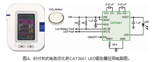 如今,越來越多的創(chuàng)新型便攜設備采用扣式電池(coin cell)供電,如醫(yī)療應用中的血糖儀、數(shù)字體溫計、血氧計、呼吸分析儀和生理監(jiān)測儀等。由于這種電池的獨特特性以及需要長工作壽命,這些緊湊型應用需要定制的LED驅(qū)動器,不僅要管理背光,還要監(jiān)測電池電量。在這類應用中,可以采用安森美半導體計劃于2010年下半年推出的CAT3661 2至2.5 V單LED驅(qū)動器。這器件同樣采用安森美半導體專利的四模(Quad Mode)電荷泵架構(gòu),能效高達92%,靜態(tài)電流低至約150 μA,提供可調(diào)節(jié)的低電池電量檢測功能,以及強固的LED故障監(jiān)測、軟啟動和短路限制等保護功能,采用低高度的3 x 3 mm TQFN-16封裝,非常適合這些便攜設備應用。