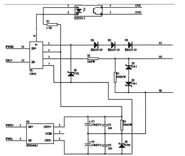 逆變器驅(qū)動電路采用日本三菱公司為驅(qū)動IGBT設(shè)計的專用集成電路M5 7962L,加少量外圍元件構(gòu)成。N87C196MC輸出SPWM信號通過外圍電路放大后直接給驅(qū)動模塊,驅(qū)動模塊直接驅(qū)動IGBT管,最大可驅(qū)動400AIGBT。當(dāng)M57962L檢測到IGBT管上C、E極電壓高與8V,而且此時IGBT管開通時,持續(xù)時間大于2.5 μ s,則發(fā)出故障信號,同時封鎖驅(qū)動波形,并且發(fā)出故障信號給N87C196MC,單片機產(chǎn)生EXTINT中斷,封鎖各路SPWM信號,高速關(guān)斷IGBT。