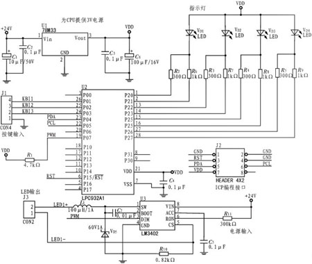 P89LPC932是由飛利浦生產(chǎn)的低功耗單片微處理器,電源電壓3.3V,可低功耗運(yùn)行,適合于許多要求高集成度、低成本的場(chǎng)合。可以滿足多方面的性能要求。P89LPC932采用了高性能的處理器結(jié)構(gòu),指令執(zhí)行時(shí)間只需2~4個(gè)時(shí)鐘周期,6倍于標(biāo)準(zhǔn)80C51器件。P89LPC932集成了許多系統(tǒng)級(jí)的功能,這樣可大大減少元件的數(shù)目、電路板的面積以及系統(tǒng)的成本,其內(nèi)部有2個(gè)定時(shí)器,可作為一個(gè)具有256個(gè)定時(shí)器時(shí)鐘周期的PWM發(fā)生器使用。LED調(diào)光電路電氣原理圖如圖2所示。