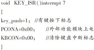 經(jīng)檢測(cè),在同等照度要求的情況下,采用LED調(diào)光控制系統(tǒng)的功耗較白熾燈降低90%以上,當(dāng)然為進(jìn)一步降低能耗,節(jié)能方法的探究仍然具有十分重要的意義。在多數(shù)時(shí)間,HBLEDs可能處于熄滅狀態(tài),若控制系統(tǒng)處于待機(jī)狀態(tài)或掉電狀態(tài),可將功耗降低到最低;或?qū)FF端口接地,也可將LM3402置于一個(gè)極低的低功率關(guān)機(jī)狀態(tài)。將微處理器P89LPC932的電源控制寄存器PCONA設(shè)置為0xFF時(shí),外部功能模塊掉電;將電源控制寄存器PCON設(shè)置為03H時(shí),可將微處理器處于完全掉電狀態(tài),只有在中斷觸發(fā)的時(shí)候,才能喚醒,隨即給外部功能模塊上電,微處理器開(kāi)始工作。微處理器主要通過(guò)鍵盤(pán)中斷喚醒,鍵盤(pán)中斷參考程序如下: