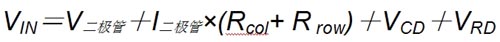 其中:V二極管是二極管的前向壓降;I二極管是流經(jīng)二極管的電流;Rcol是列連接的電阻;Rrow是行金屬的電阻;VCD是列驅(qū)動(dòng)器所需的開銷;VRD是行驅(qū)動(dòng)器所需的開銷;在典型應(yīng)用中,VIN大約為20V。