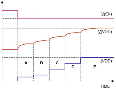 在A部分,通過限制流過分?jǐn)嚅_關(guān)的電流來減少負(fù)載電容充電時(shí)的浪涌電流;在B部分,升壓轉(zhuǎn)換器的開始電流限制在25%;在C部分,電流限制設(shè)在50%;在D部分電流限制為75%;在E部分,電流限制為100%。