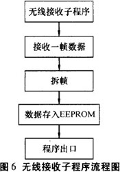 由單片機(jī)控制LED的亮滅和無線數(shù)據(jù)的接收.數(shù)據(jù)通過無線模塊接收后,單片機(jī)的串行接口收到數(shù)據(jù)并傳到主控芯片AT89S8252中處理,當(dāng)有無線數(shù)據(jù)傳到時(shí),優(yōu)先處理接收數(shù)據(jù).顯示屏主程序流程圖見圖5。無線數(shù)據(jù)接收子程序流程圖見圖6。顯示屏能否清晰顯示內(nèi)容主要從以下幾方面考慮:1)單片機(jī)控制LED的亮滅時(shí)間:T=S/V,S為LED面寬度,為電機(jī)轉(zhuǎn)動(dòng)線速度;2)電機(jī)轉(zhuǎn)動(dòng)時(shí)軸心保持平衡;3)環(huán)境光線對比度。