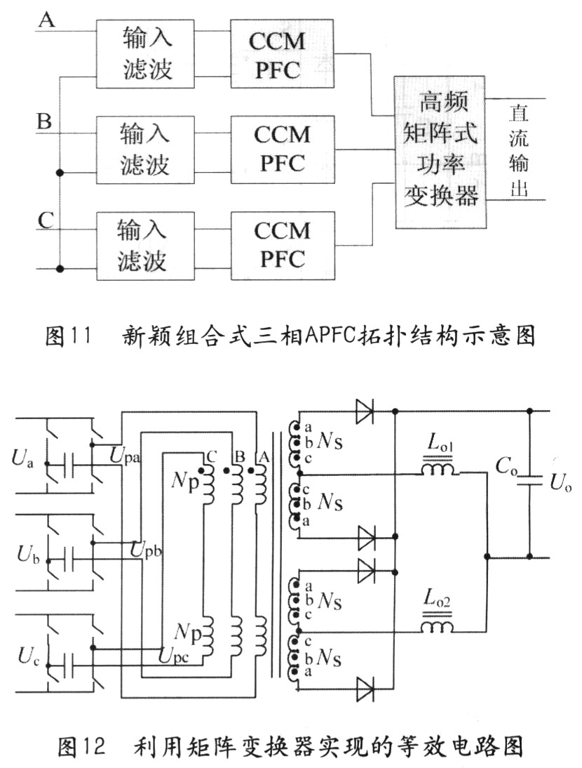 新穎組合式三相APFC拓?fù)浣Y(jié)構(gòu)示意圖如圖11所示,該電路由三個(gè)單相PFC電路組合而成,與前面所介紹的三相組合式PFC電路極其相似,不同點(diǎn)在于,該電路中三個(gè)單相PFC的輸出并不是直接將三個(gè)單相直流輸出電壓并聯(lián),而是通過高頻矩陣式功率變換器,使三個(gè)單相PFC直流輸出耦合成一路直流輸出。該電路的關(guān)鍵在于引入了矩陣變壓器技術(shù),充分利用了矩陣變壓器磁耦合原理。其等效電路圖如圖12所示。