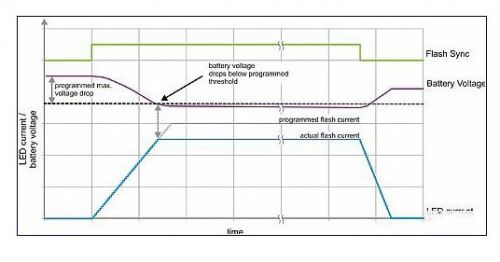 TI 擁有一種監(jiān)控電池電壓的閃光燈驅(qū)動(dòng)器技術(shù)。要獲得穩(wěn)定的 LED 電流波形并且避免過(guò)多的電池壓降,閃光燈驅(qū)動(dòng)器要主動(dòng)控制 LED 電流上升/下降順序。在上升階段(上升斜率為 25mA/12?s),要對(duì)輸入電壓進(jìn)行監(jiān)控。如果輸入電壓降至某個(gè)設(shè)定閾值以下,則器件即刻停止讓 LED 電流進(jìn)一步上升至該設(shè)定閾值,并將閃光燈電流保持在實(shí)際電平,參見(jiàn)圖 5。