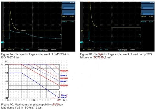 在具有13.5V Vbatt和400ms脈寬的ISO-7637-2 pulse 5測試條件下,Vishay甩負荷TVS的最大鉗位性能如圖7C所示。為防止出現(xiàn)圖7B中的失效,需要充分考慮TVS的最大定額。