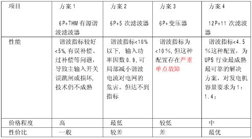 方案2:采用6脈沖UPS+5次諧波濾波器,如果UPS整流裝置為三相全控橋6脈整流器,由整流裝置產(chǎn)生的諧波占所有諧波的近25-33%加5次諧波濾波器后減小到10%以下, 輸入功率因數(shù)0.9,可局部減小諧波電流對(duì)電網(wǎng)的危害。這種配置,輸入電流諧波仍然偏大,對(duì)發(fā)電機(jī)容量配比要求為1:2以上,并存在導(dǎo)致發(fā)電機(jī)輸出異常升高的隱患;