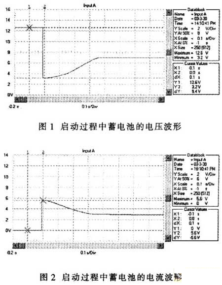 超級電容器與蓄電池并聯(lián)時(shí),汽車啟動過程的電壓波形如圖4所示,電流波形如圖5所示。與圖1和圖2相比,啟動瞬間電壓跌落由只采用蓄電池時(shí)的3.2V提升到7.2V;啟動電流從560A提高到l200A;啟動瞬時(shí)的電源輸出功率從2kW上升到8.7kW;啟動過程的平穩(wěn)電壓由7V提高到9.4V;啟動過程的平穩(wěn)電流由280A提高到440A;啟動過程的電源平穩(wěn)輸出功率從2.44kW提高到4.12kW。