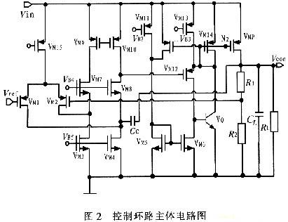 閉環(huán)控制系統(tǒng)的主體電路如圖2所示,VM1~VM8組成折疊式的誤差放大器,VM9~VM10組成單級的電流鏡作為負載,這樣做的好處就是采用10 pF左右的補償電容就可以使系統(tǒng)達到穩(wěn)定。VM5~VM14和VQ組成級間緩沖級。R1和R2組成反饋網絡,其中