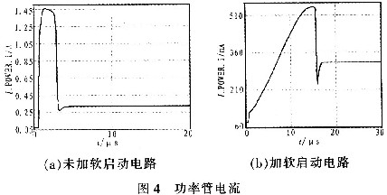 圖4為系統(tǒng)剛啟動時,流過功率管VMP管的電流,圖4(a)為沒有加軟啟動電路時,流過P功率管的瞬態(tài)電流,其峰值電流高達1.45 A。圖4(b)表明軟啟動電路分別從斜率和峰值成功地控制了瞬態(tài)電流,其峰值僅為520 mA,上升的斜率幾乎是一恒定值,不過這會增加系統(tǒng)的響應時間。因此可以根據應用系統(tǒng)的其他要求確定浪涌電流的斜率和峰值。