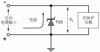 在反向電源輸入模式中,電源線電壓與TVS VF的電壓相同,這種反偏模式會(huì)引起電子線路故障,外延型TVS的低正向壓降能夠很好地解決這個(gè)問題,如圖8所示。