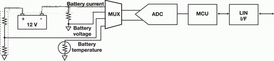 (3) 通信接口:目前,本地互連網(wǎng)絡(luò) (LIN) 接口是電池傳感器和ECU之間最常用的通信接口。LIN是廣為人知的CAN 協(xié)議的單線、低成本替代方案。