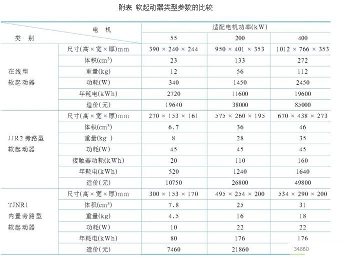 從表中可以看出,旁路型軟起動器優(yōu)于在線型軟起動器,而內(nèi)置旁路型軟起動器的優(yōu)于旁路型和在線型軟起動器。但價格卻是越先進(jìn),成本越低,這是高科技的一般規(guī)律。以附表內(nèi)舉例品牌來比較,在線型軟起動器是旁路型軟起動器的1.5倍,旁路型軟起動器的是內(nèi)置旁路型軟起動器的1.4倍(不算接觸器的價格)。而能耗比較,在線型軟起動器是旁路型軟起動器的10倍左右,而旁路型軟起動器的是內(nèi)置旁路型軟起動器的7倍左右。