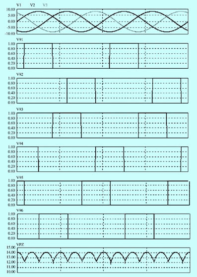 虛擬整流技術(shù)的實(shí)現(xiàn),主要通過三相同步檢測(cè)電路取得同步控制信號(hào),然后控制功率器件來模擬二極管橋式整流電路對(duì)三相交流電進(jìn)行整流,同時(shí)防止輸入的三相交流電相間短路。其原理如圖9所示,是一個(gè)輸出方向固定的虛擬整流電路。仿真波形如圖5所示,它們分別是矩陣變換單元的三相輸入電壓、6路同步信號(hào)和虛擬整流后得到的輸出電壓波形。