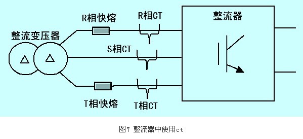 整流器中電流檢測元件采用的是nnc系列有源電流互感器(簡稱CT),整流器中使用CT情況如圖7所示。