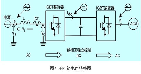 鑒于整流器和逆變器相互之間是分別獨(dú)立運(yùn)行的,它們是分別獨(dú)立可控的,能對整流器的功率因數(shù)進(jìn)行獨(dú)立控制,而不受馬達(dá)負(fù)荷及運(yùn)轉(zhuǎn)速度的影響,如圖2所示。